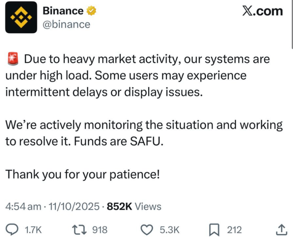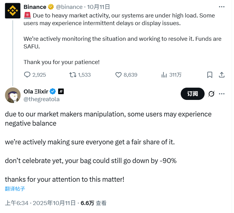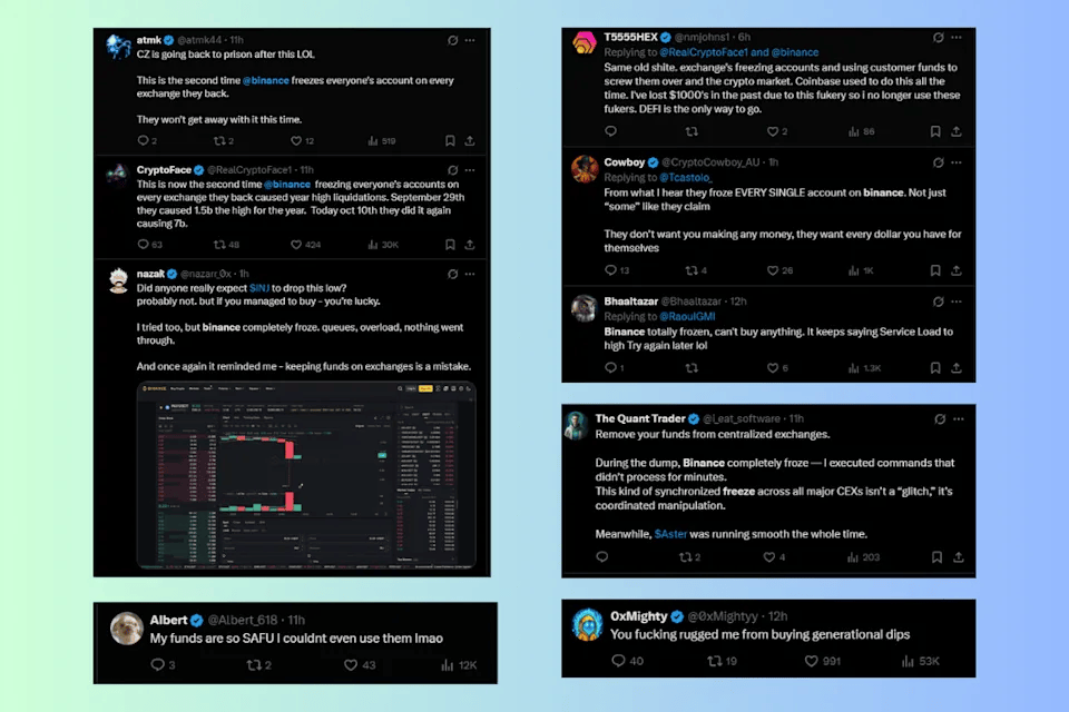 而当市场最需要流动性时,部分中心化交易所(CEX)却掉了链子。在清算高峰期,币安等交易所出现系统延迟和交易中断,大量用户报告无法执行订单或管理仓位,导致损失扩大。