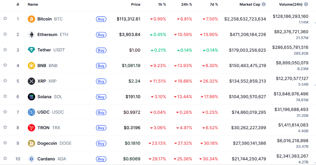 比特币价格周五从逾12.6万美元历史高点大幅回落,,当天跌幅达13.5%。以太币一度暴跌逾17%,瑞波币和狗狗币则更是暴跌逾30%。