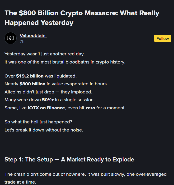 根据币安广场上一篇广为流传的帖子分析,这次并非毫无征兆,而是在一个高度杠杆化的市场环境中缓慢酝酿的。