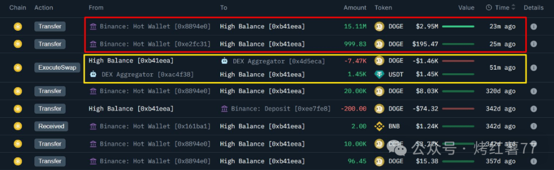 11 个月没动的 “鲸鱼” 回来了,还从B安提了 295 万美元的狗狗币