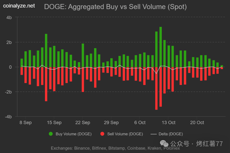 写这篇的时候,狗狗币的卖出量是 1.5667 亿枚,买入量只有 1.5488 亿枚,卖的比买的多了 179 万枚。这就能解释为啥鲸鱼在买,行情还是没起来 —— 散户的抛压还没过去。