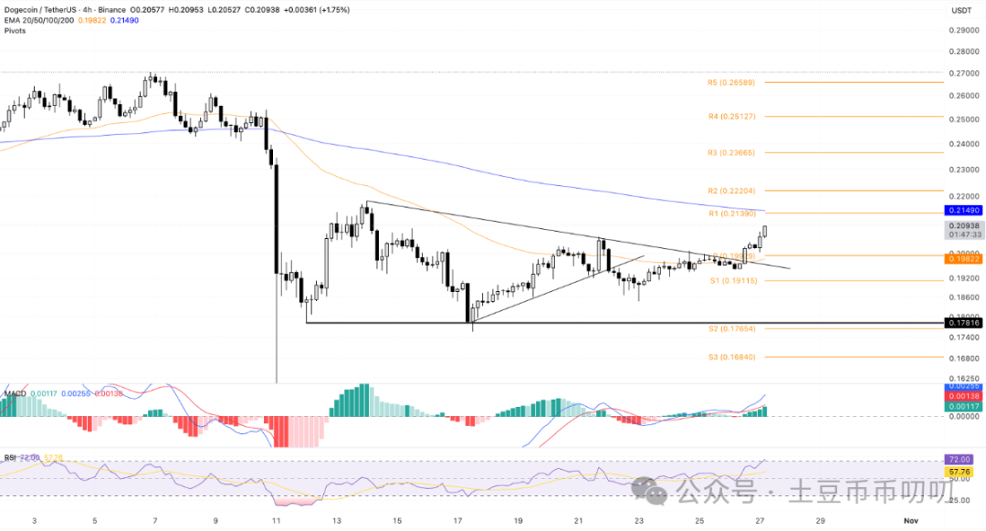 技术面也在给劲儿:MACD 指标的绿色柱子慢慢消失,转而向上冲到零轴上方,两条平均线也稳步抬头,看涨信号越来越明显。不过要注意,RSI 已经飙到 72,进入超买区域,短期可能会有小幅回调。要是不小心跌破 0.20000 美元,就得看 S1 枢轴点 0.19115 美元的支撑能不能扛住。