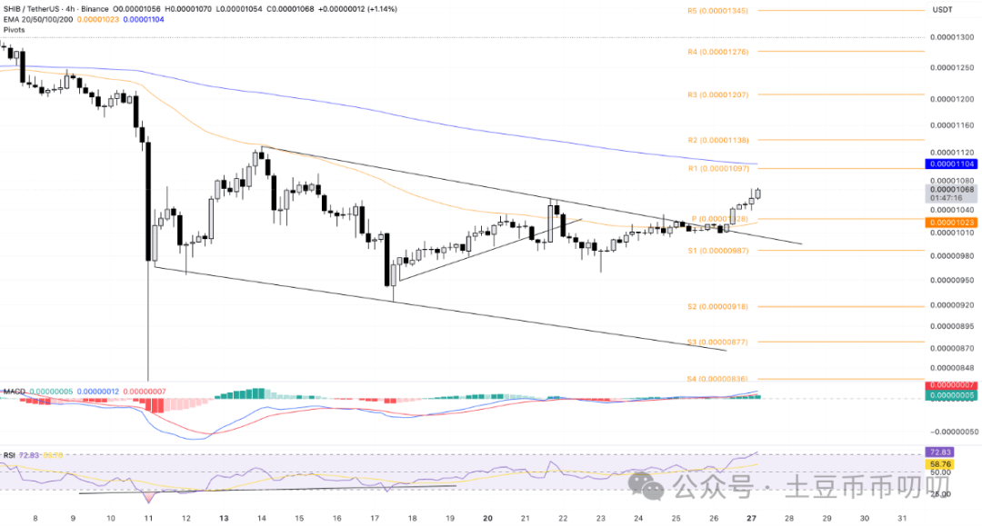 技术指标也很配合:MACD 和信号线在零轴上方开启新一波上涨,RSI 同样到了 72 的超买区间,买盘力量很足。但如果守不住 0.00001000 美元,可能会回调到 S1 枢轴点 0.00000987 美元。