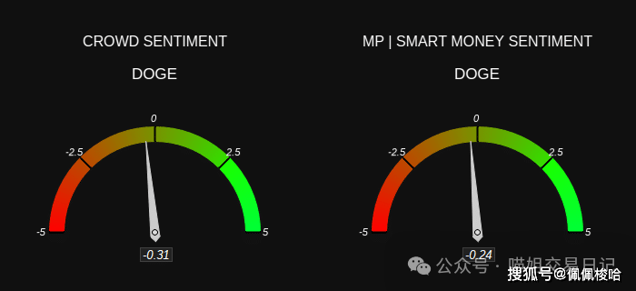 与此同时,市场情绪指标显示,无论是普通投资者还是精明投资者都看跌。这两个指标的读数分别为-0.31和-0.24,表明知情投资者认为狗狗币下跌的可能性更大。