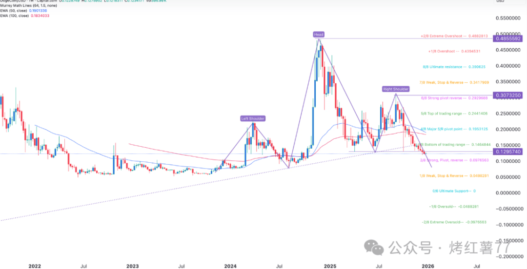 目前价格不仅跌破颈线,也处于所有常用均线及Murrey Math Lines关键位0.195333美元之下,整体结构偏空。若继续下行,下一关键心理关口在0.10美元,一旦失守,可能打开更深下跌空间。