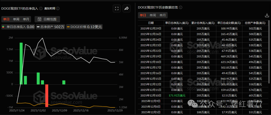 多项数据印证了市场对狗狗币的热情正在退潮。尽管去年11月Grayscale和Bitwise的狗狗币ETF获批上市,但据SoSoValue统计,两只ETF累计资金流入仅约200万美元,目前总资产管理规模仅为500万美元。