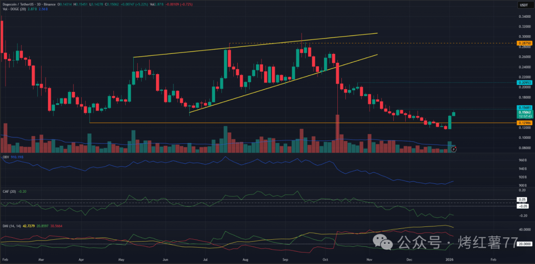 去年12月,狗狗币一度跌破$0.13关口——这一位置曾在今年4月形成支撑,随后引发近两个月的上涨。进入1月,DOGE 价格快速拉升,虽然长期趋势尚未逆转,但短期动能已明显转强。