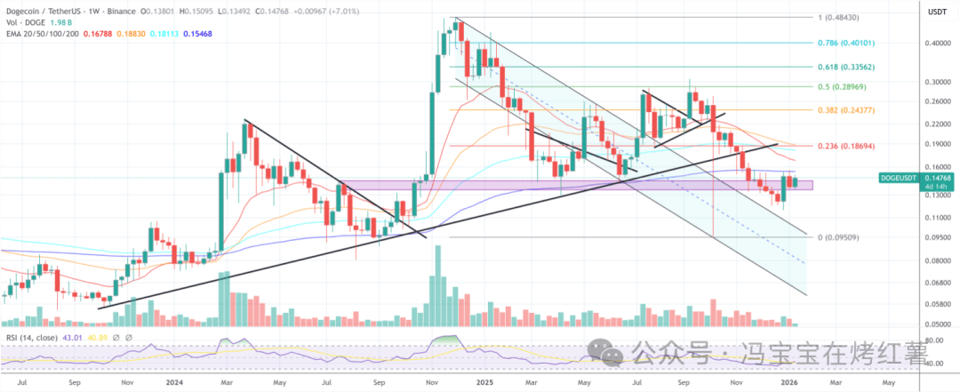 具体走势:DOGE自0.1510开启下行,先后跌破0.150、0.1450,低点逼近0.1348-0.1512上涨区间的50%斐波那契回撤位。多头在0.1420支撑位活跃,遏制了进一步下探。
