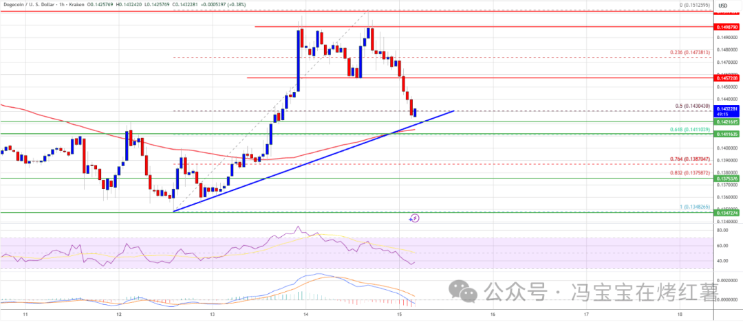 1.支撑位企稳:据数据,DOGE小时图中,0.1420上升趋势线逐步形成,当前价格站稳该支撑位且高于100小时简单移动平均线,短期下行压力缓解,多头仍有博弈空间。