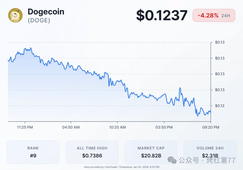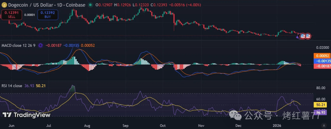 虽然成交量萎缩暗示短期抛售或近尾声,但整体结构仍偏空,需强势反弹至0.127上方,才能重建多头信心。截至发稿,狗狗币报0.1237,24小时跌幅4.28%。