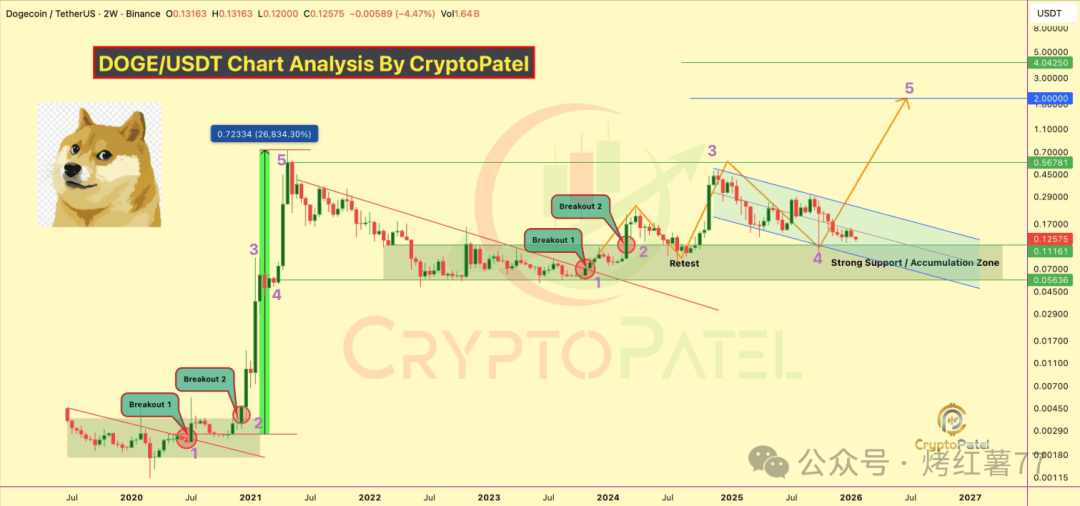 尽管短线承压,但分析师Crypto Patel指出,狗狗币目前正处于一个长期的积累区间,其结构与2020-2021年暴涨前形态高度相似。