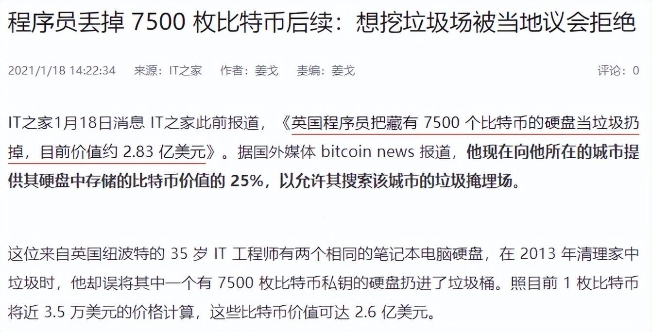 随着比特币的热度不断升温,这名程序员才猛然想起自己曾经拥有的比特币。然而,无论他怎么翻遍家里的每个角落,都始终找不到那块硬盘,最后才从妻子那里得知硬盘已经被当垃圾丢掉了。