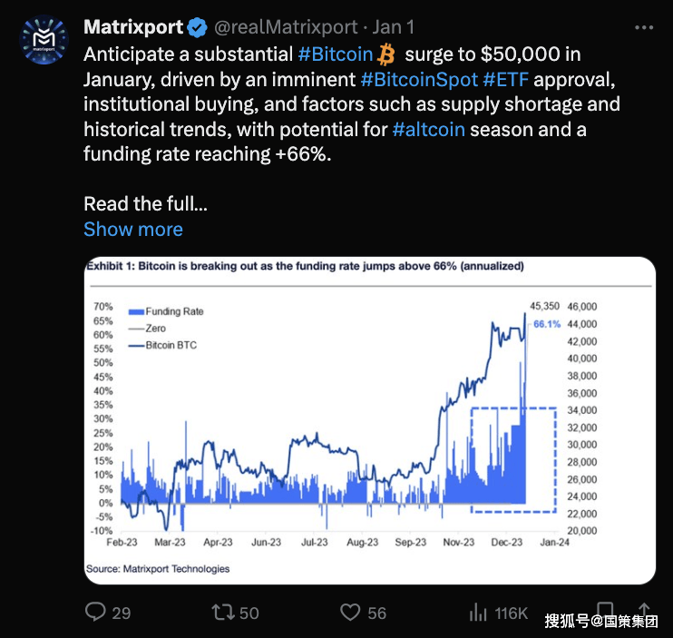 Matrixport 于 1 月 1 日在 X(前 Twitter)上表达了对比特币将飙升至 50,000 美元的信心,原因是“比特币现货 ETF 即将获得批准”等因素。该公司还表示,比特币 ETF 现货的批准可能会早于大多数交易者预期的1 月 8 日、9 日或 10 日批准。