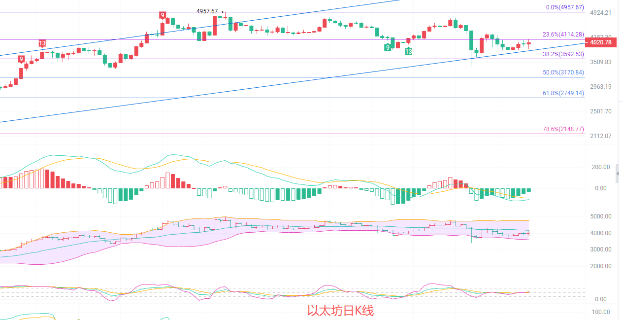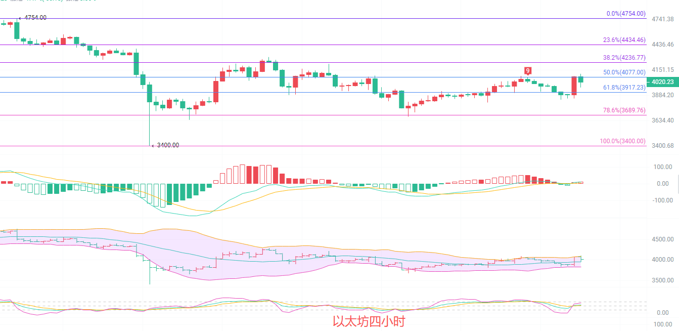 四小时K线慢跌了两天,一朝扳回破了前高4077,也试探EMA120一线的阻力,预计主力会在分割线这个位置横盘从新选择防线,MACD缩量被扳回并且放量上行的行情,加上DIF和DEA在4000关口多空来回交换,可以考虑在破前高以后南下,布林带上轨压力关注4085,下轨关注3830,南北的入场点可以以此为基点选择