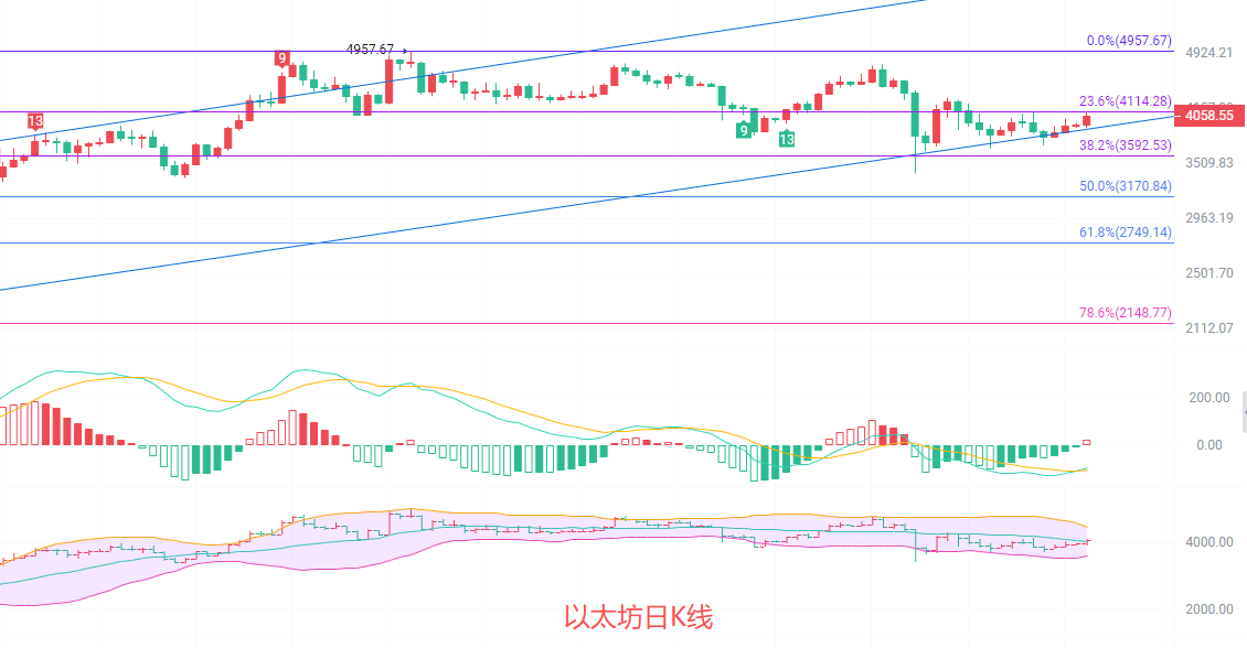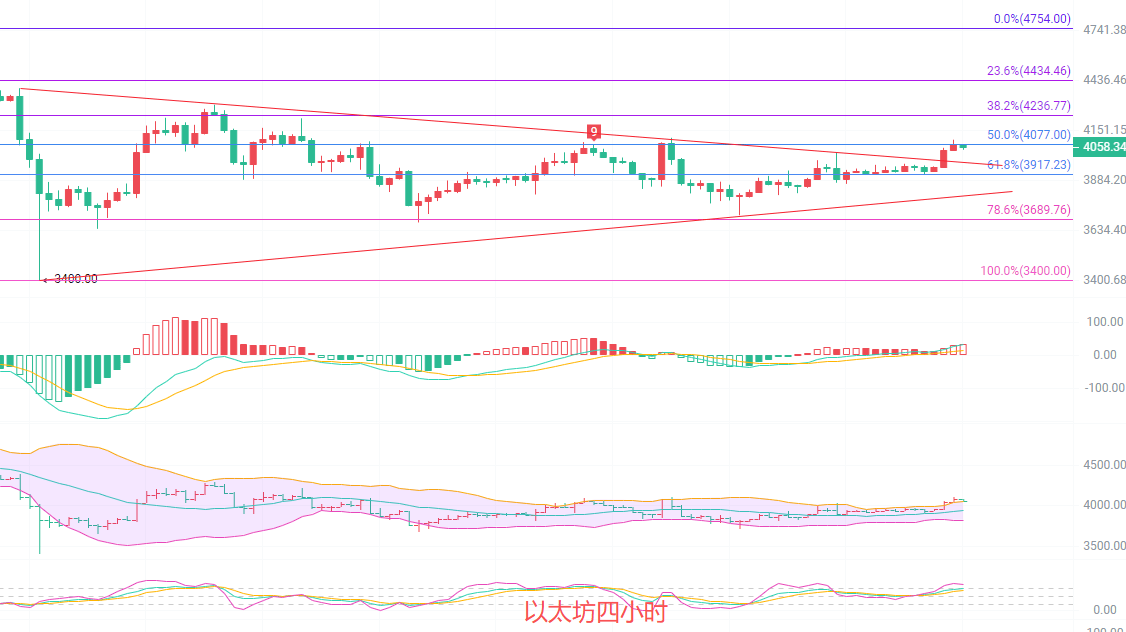 四小时K线拉伸破了EMA趋势指标高点阻力位4025冲击黄金分割线,目前并没有实体突破,三角口破了以后主力会不会回踩三角支撑3990?亦或者这波属于诱多行情未可知,MACD连续放量拉伸,DIF和DEA并没有走出能量指标,布林带开口扩散K线以后开始回到通道内,目前的盘口建议一颗红心做好两手准备
