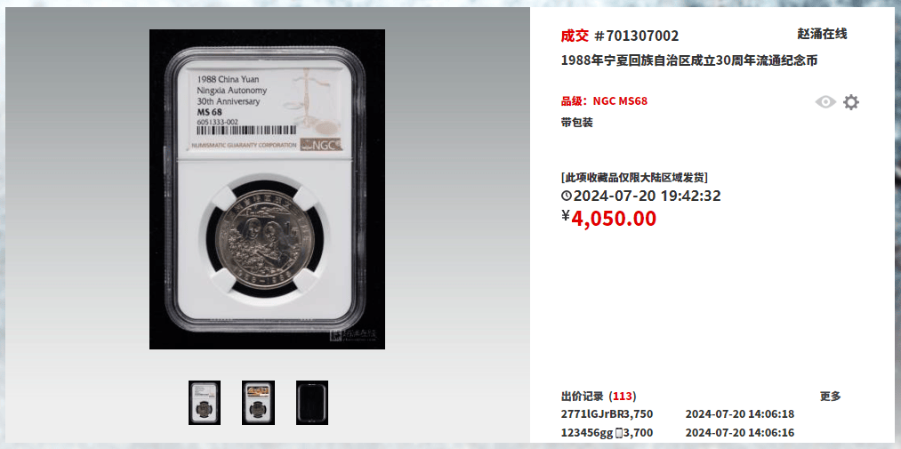 这枚1988年宁夏回族自治区成立30周年纪念币的高价成交,无疑是收藏市场中的一个惊艳亮点。
