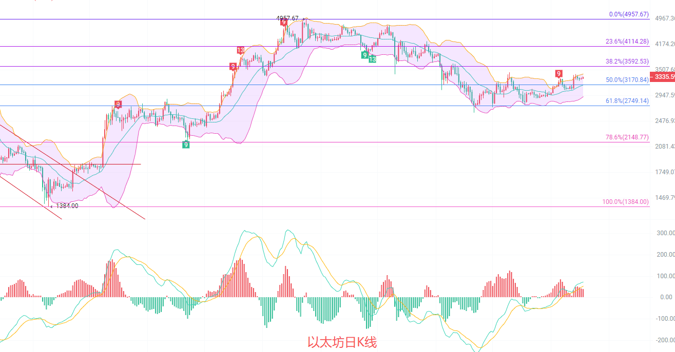 日K线,EMA趋势指标收缩即将冲破3170,进入强势北上的行情阶段,本周能否抵达黄金分割线前高的盘口有多少筹码,MACD连续放量上行,DIF和DEA在0轴线上方扩散,布林带上轨来到了3415,北上不变