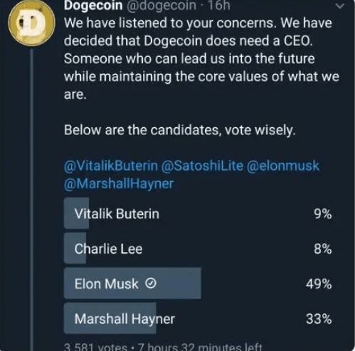 2019年狗狗币在推特发文投票选择“首席执行官”,马斯克获选。并在推特发文称“狗狗币可能是我最喜欢的加密货币,它太酷了。”并将其个人推特账户简介改成 “狗狗币首席执行官”。马斯克经常在推特上发文宣传狗狗币,称“狗狗币是他最喜爱的加密货币”。