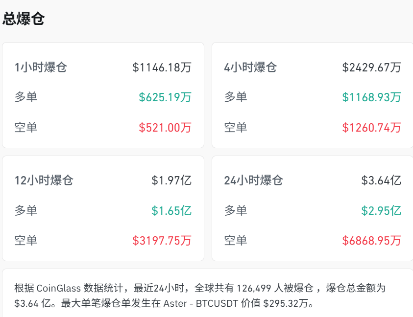根据CoinGlass数据统计,最近24小时,全球共有126,490人被爆仓,爆仓总金额为3.64亿美元。
