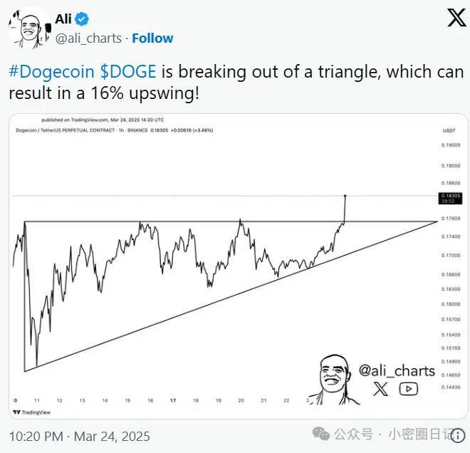 加密分析师 Ali 在 X 上分享的 TradingView 图表显示,DOGE 在 1 小时时间框架内突破上升三角形模式。2025 年 3 月 24 日,DOGE 突破 0.18305 美元阻力位,形成看涨突破信号,或预示进一步上涨空间。