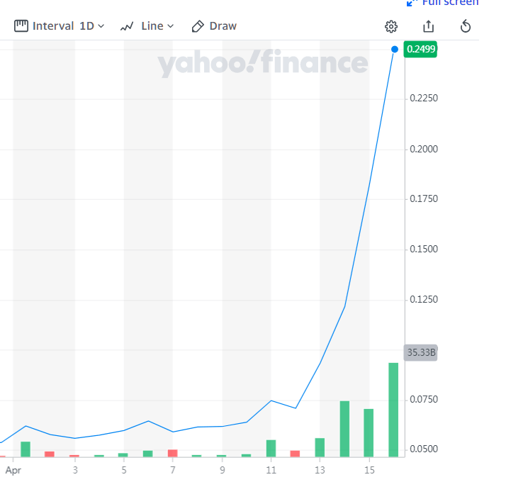 4月16日再度暴涨,24小时内涨幅一度达250%,最高触及0.47美元/枚,