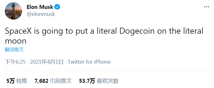 图:2021年4月1日,马克斯发推特说,SPACEX航天计划,会将狗狗币带上月球。