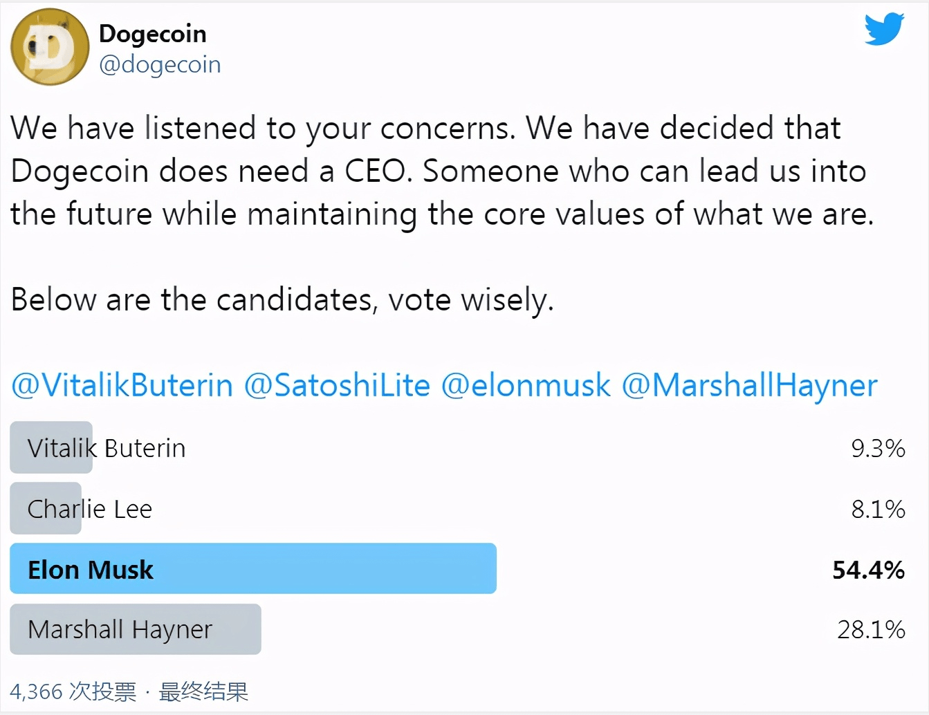 2019年,狗狗币官方推特进行投票:如果狗狗币有CEO,大家希望谁来当?