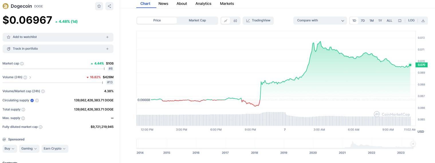 在马斯克推文提及狗狗币后,狗狗币迎来强势反弹,据CoinMarketCap数据,狗狗币从周二最低报价0.066美元,一度飙升至最高约0.072美元,波动幅度近10%。当前,狗狗币微幅回落至0.06967美元。