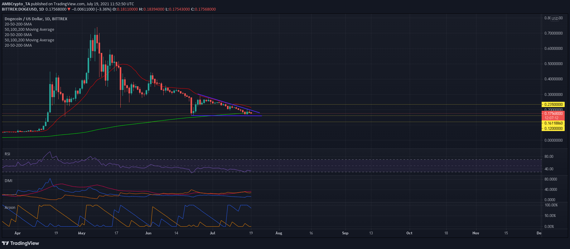 做空一直是狗狗币市场的一种方式,交易者也必须采取相同的策略向前发展。但是,在进入另一个空头头寸之前,必须等待确认跌破 0.161 美元。相反,看涨的结果将取决于高于每日 20-SMA(红色)0.215 美元的走势。