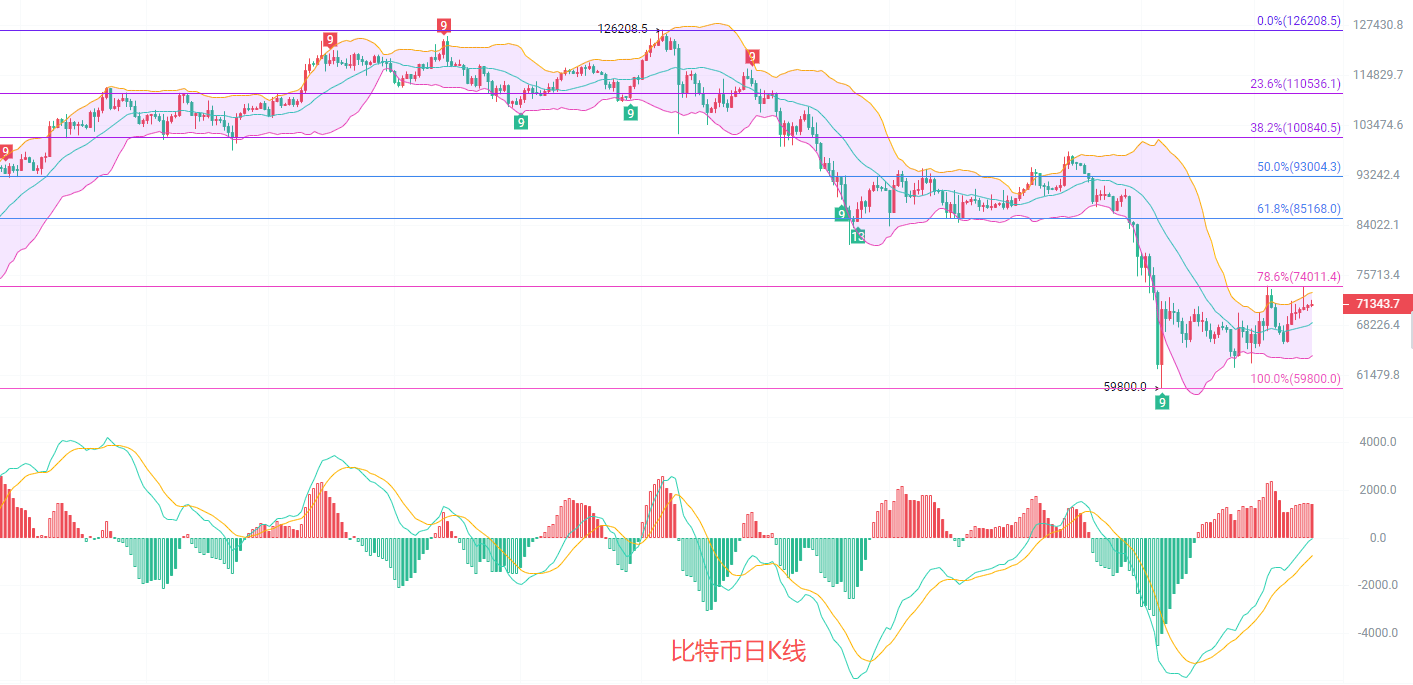 从日线阻力位,现在正好卡在 7 万关口反复震荡。形态上走出上升旗形,底部结构非常扎实,说明这波下跌只是牛市中的回调,不是趋势反转。MACD多头动能会彻底爆发;布林带中轨已经拐头向上,价格站稳在中轨之上,下跌空间被彻底封死,说明主力在悄悄吸筹,洗得越久,后面涨得越猛!