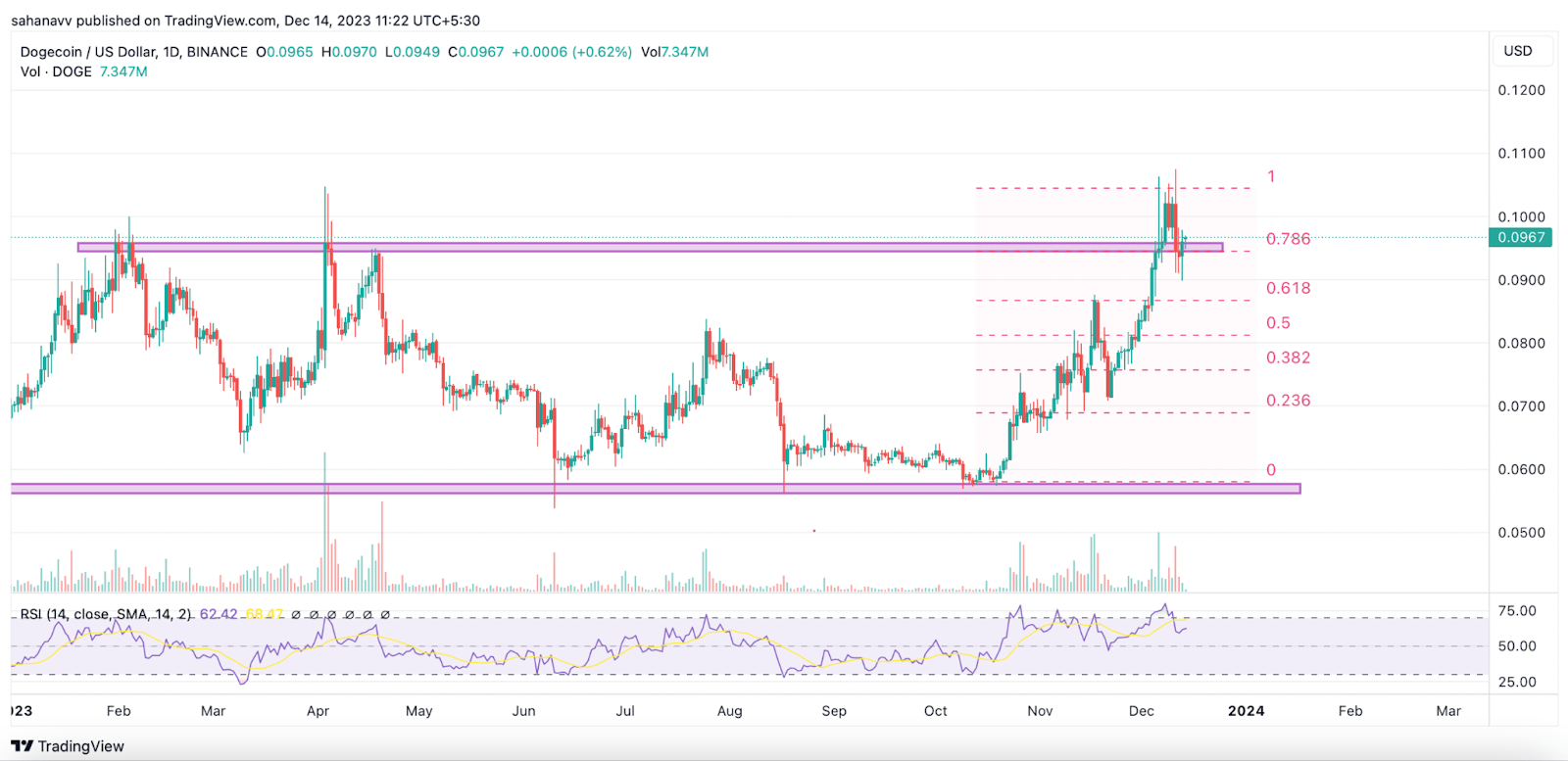 自11月初以来,狗狗币(DOGE)的价格一直在稳步上涨,且一直保持这种趋势至今。RSI指标也徘徊在上方阻力附近,这是自2021年创下高点以来从未观察到的。这表明多头的力量正在不断增强,他们似乎正在等待合适的时机利用这种力量。