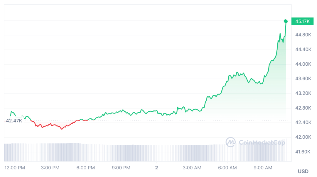 比特币交易价格自 2022 年 4 月以来首次突破 45,000 美元。来源:TradingView