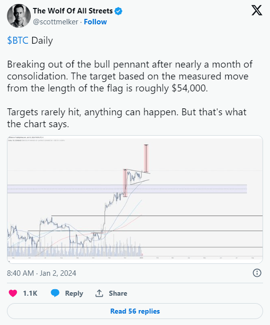 X 上的交易员则持不同看法,斯科特·梅尔科 (Scott Melkor) 告诉他的 925,000 名追随者,比特币在价格在 40,000 美元大关附近盘整一个月后,目前正在形成“牛旗”。