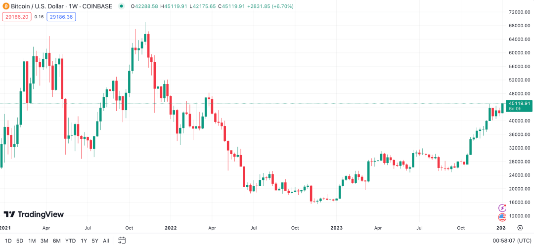 根据 TradingView 的数据,比特币上次交易价格超过 45,000 美元是在近 20 个月前的 2022 年 4 月 5 日,当时比特币收盘价为 45,241 美元,然后陷入持久的熊市,比特币跌至 15,600 美元。
