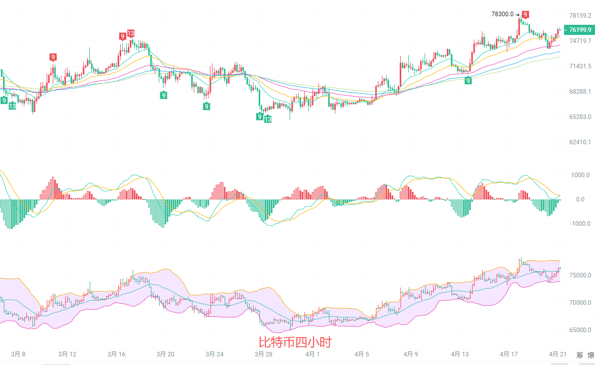 四小时K线附近震荡,EMA均线北上排列,短期趋势偏多。MACD指标红柱缩量,DIF与DEA粘合走平,北上动能减弱,有回调需求。布林带中轨75757支撑较强,价格在上轨附近遇阻,短线大概率回踩确认支撑,再选择方向。