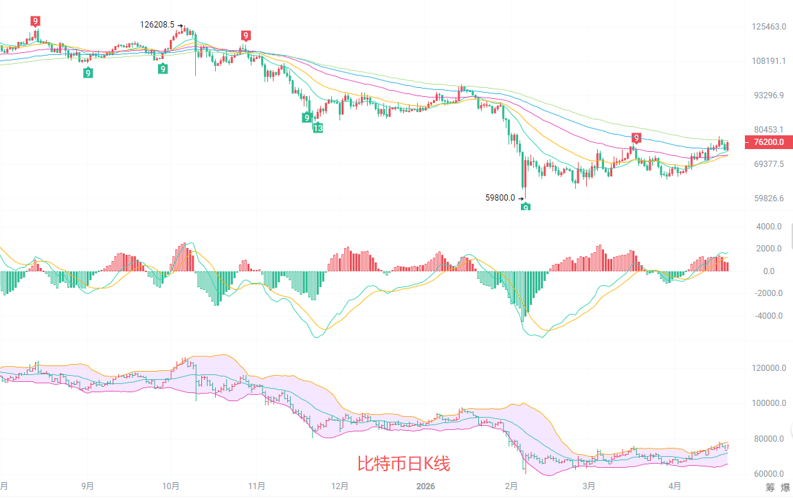 日K线均线压制,站上关键短期支撑位。MACD指标红柱持续放大,DIF与DEA金叉后向上运行,北上动能逐步积累。布林带中轨71970支撑有效,价格向布林带上轨78325发起冲击,若无法放量突破,大概率会进入横盘震荡。