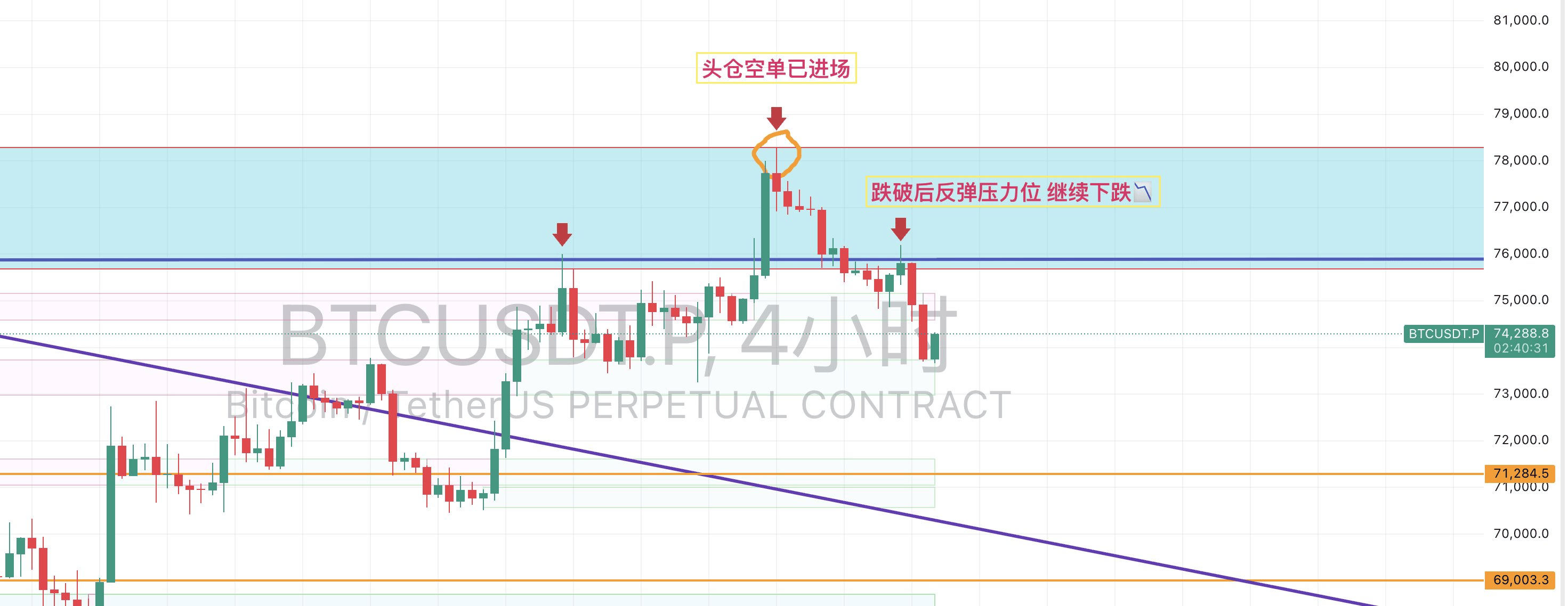 比特币早上收了根带长上影的阴线附近提示做空,现在浮盈5000点。走势很标准:跌破76后反弹遇压,接着继续跌。日线级别从三角形假突破演变成上升通道,本质都是中继形态,下跌趋势还没完。现在所有的上涨只是反弹,压力位在78-81之间,反弹完还得跌。