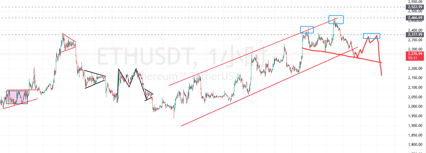以太坊已经跌破了上升通道,日线小时级别有反弹需求,等反弹到2350-2380附近,直接空。