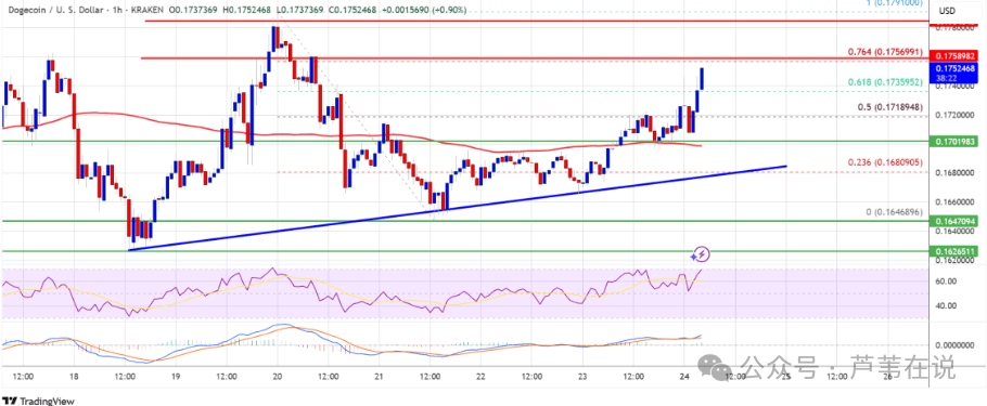 DOGE 先是跌破了0.1750 美元和0.1720 美元的支撑位,甚至一度跌到0.1646 美元,让不少“狗爸狗妈”捏了一把汗。不过,DOGE 很快找到了支撑,目前交易在0.1680 美元上方,并且还守在100 小时均线之上。更棒的是,DOGE/USD 的小时图上还形成了一条看涨趋势线 美元。